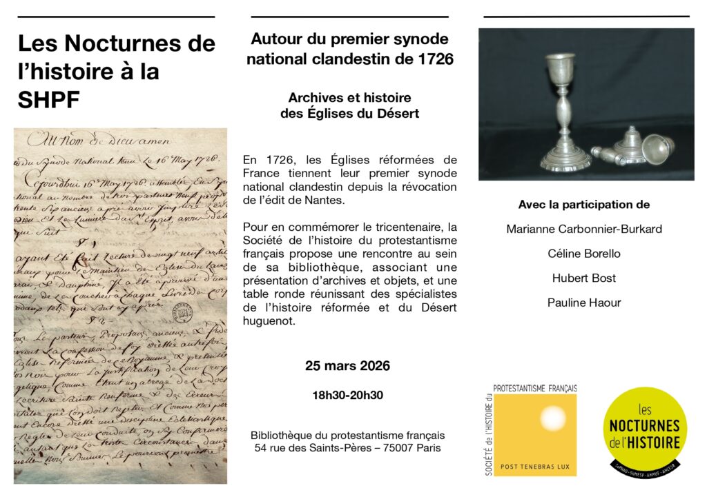 Du 18 février au 31 juillet 2026 Bibliothèque du Protestantisme français, 54 rue des Saints-Pères, 75007 Paris LIRE LA SUITE >Conférence de Ruth WHELAN « Dans les basses-fosses du Château d’If. Les prisonniers protestants sous Louis XIV »