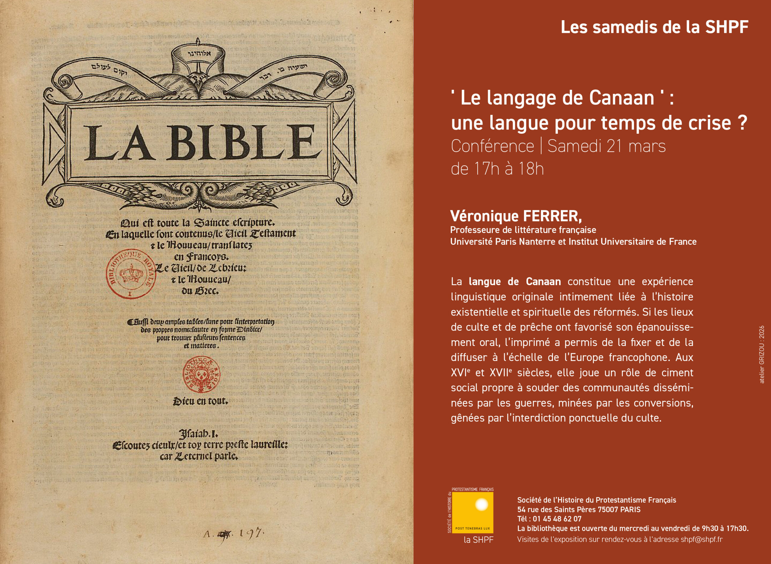 21 mars 2026 Bibliothèque du Protestantisme Français, 54 Rue des Saints-Pères, 75007 PARIS Conférence de Véronique FERRER « ‘Le langage de Canaan’ : une langue pour temps de crise ? »