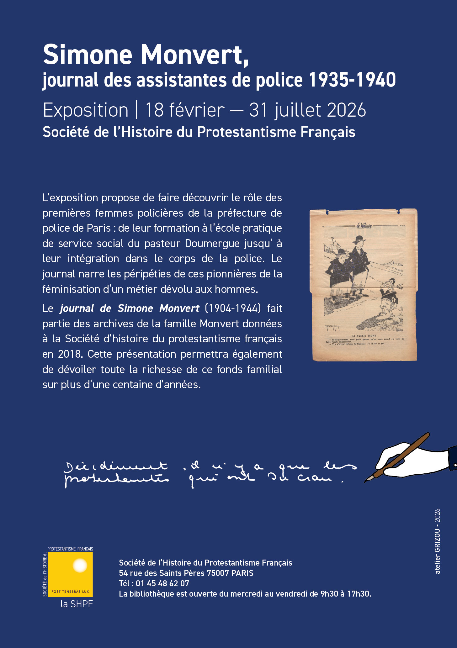 Du 18 février au 31 juillet 2026 Bibliothèque du Protestantisme français, 54 rue des Saints-Pères, 75007 Paris Exposition « Simone Monvert, journal des assistantes de police 1935 -1940 »
